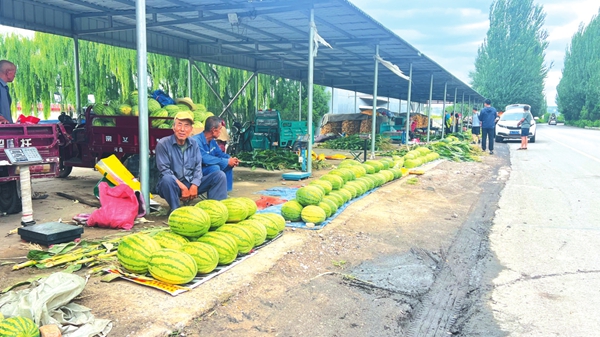 市场有回响,品质过硬销路旺。在村里的瓜果交易市场,75岁的邬培林摊位前,一排排个头饱满的西瓜格外显眼。有着多年种植经验的他对市场行情了如指掌:“西瓜上市半个多月了,刚开始卖两元一斤,现在是6角一斤,正在陆续降价。”虽然价格随上市时间有所回落,但西瓜品质好不愁销路。