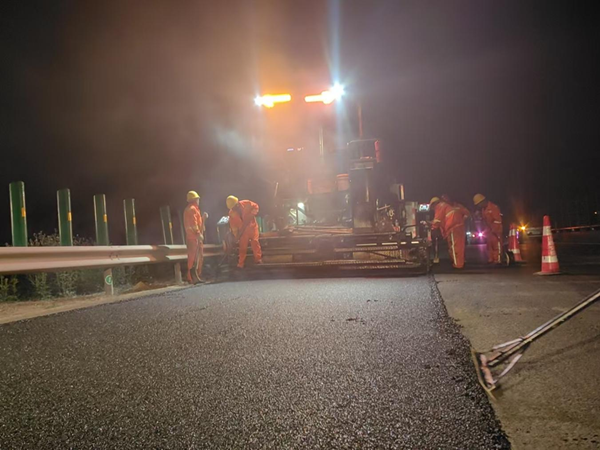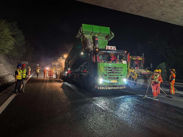 夜幕下,施工现场依旧灯火通明、机械轰鸣。摊铺机、压路机等大型设备在夜色中往来穿梭,明亮的车灯与闪烁的警示灯交织成一幅繁忙的施工图景。头戴安全帽、身着反光服的工人坚守岗位,紧张有序地开展路面铣刨、沥青摊铺、压实等作业。连续奋战多日的摊铺机操作员李师傅表示:“能为改善路况出一份力,再累也值得。看着崭新的路面一点点成型,心里特别有成就感。”正是这份责任与使命感,凝聚起全体施工人员攻坚克难的强大动力。为确保夜间施工安全高效推进,忻州公司建立严密的安全保障体系,在施工区域设置全套标准化安全警示标识、安排专人24小时安全巡查与技术指导,配备充足的照明设备和防护物资,全方位保障施工安全。