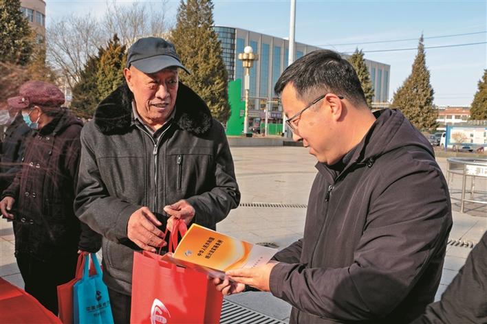 12月8日,五寨县统计局在该县新时代人民广场、迎宾广场设立统计法律法规宣传点,采取集中宣传的方式向过往群众发放统计宣传资料,并向群众解答相关问题,为依法统计营造了良好的社会氛围。图为工作人员在向群众发放《统计法》宣传资料。 (张向荣摄)