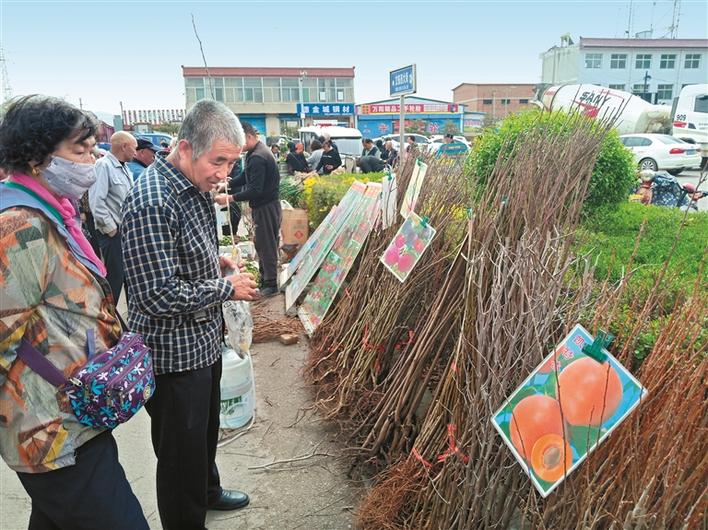 4月14日,原平市农民们正在德金城农贸市场挑选苹果树、山楂树等栽培树苗。近年来,当地不少农民利用家庭院落、房前屋后发展栽培种植,既美化了环境,又增加了收入。(赵春晓摄)