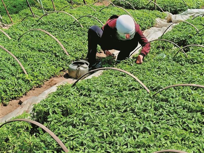 近日,在原平市解放街村蔬菜育苗基地,辣椒、黄瓜、西红柿等各种种苗长势喜人。图为农民们正在挑选种苗。(赵春晓摄)