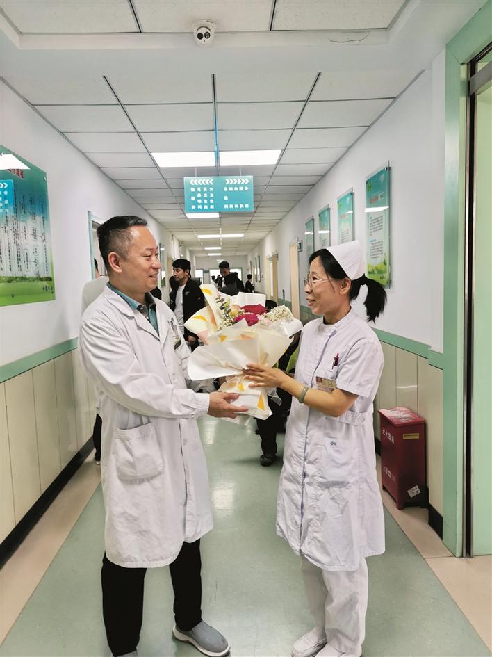 近日,在国际护士节来临之际,市中医医院外科医生张世伟给同在医院工作的妻子杨丽送上鲜花、同庆节日。(王金龙摄)