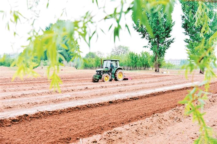 初夏时节,原平市积极组织抢墒耕种工作,大小农机具下田,粮食种植全面铺开。图为原平市吉祥街道办张村大型农机具正在进行耙地,抢墒播种。 (吉建平摄)