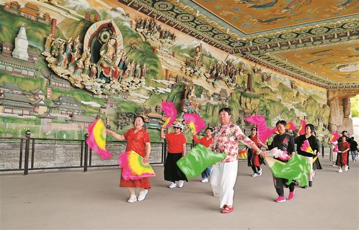 五月十八日,在繁峙县憨山文化旅游景区,广场舞爱好者踏着动感的音乐节拍起舞,成为景区的一道亮丽风景。 (张存良摄)