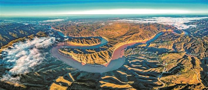黄河老牛湾风景区位于忻州市偏关县和内蒙古清水河县交界处,黄河从晋蒙峡谷自北向南蜿蜒前行,蓝天、白云、绿岸、夕阳形成了这个季节特有的秀美景色,吸引各地游人到此观赏。 (薛 俊摄)