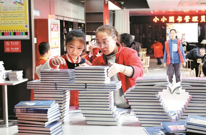 寒假期间,市新华书店开展了“小小图书管理员”职业体验活动。小学生们通过图书知识课堂和图书上架、整理归类、花式打包等岗位劳动职业体验,让假期变得更有意义。图为小管理员在图书大厦老师指导下学习图书造型陈列。 (宫清华摄)