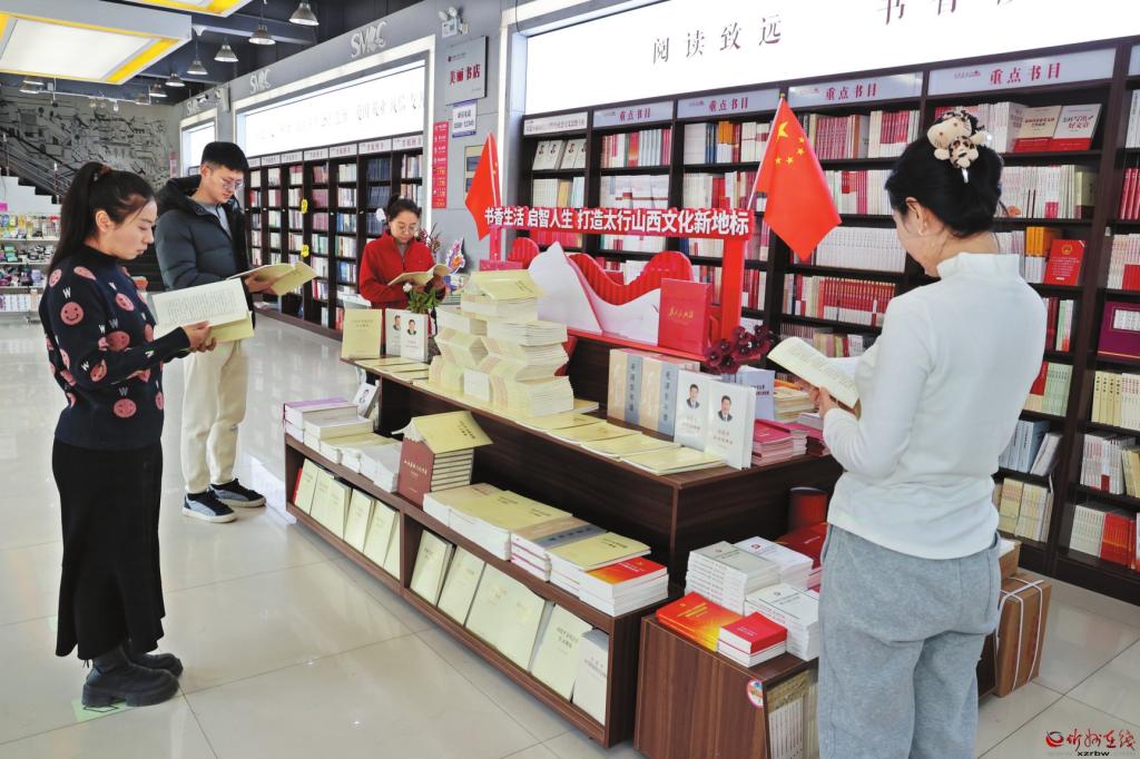 《习近平文化思想学习纲要》出版发行以来,忻州市新华书店积极组织货源,第一时间设立专柜重点展示销售,广大读者踊跃选购。 (记者 张存良摄)