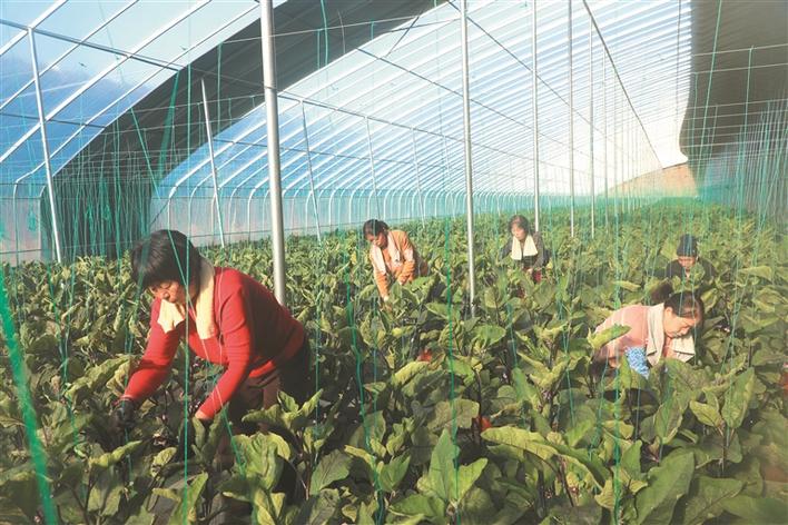 3月18日,原平市北城街道沙晃村同兴现代农业园区,农民正在日光温室大棚采摘茄子。近年来,沙晃村立足城郊融合性乡村优势,加快推进高标准冬暖式日光温室大棚建设,采取“公司+合作社+农户”的运营模式,打造“新品种、新技术、新模式”的农业产业园区,发展特色蔬菜产业,带动农民增收致富。(褚 震摄)