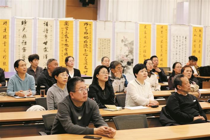 3月22日晚,原平市范亭文体广场图书馆一楼报告厅内灯火通明,座无虚席。冯向阳老师在时光读书会与百余位书友品读共享《中国古代纪时考》。自2014年创办以来,该读书会已累计举办399期读书活动,内容涵盖摄影、书画、音乐、朗诵等领域,着力推动全民阅读,为共建书香社会营造了良好氛围。(褚 震摄)