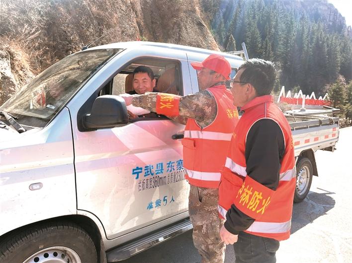 “进山请扫码登记,先把火种暂存在我这儿!”在宁武县涔山乡支锅石防火检查卡点,生态护林员正在对过往车辆及行人进行严格登记,从严管控火源入山,把好护林防火“第一关”。 (吴光宇 刘 强摄)