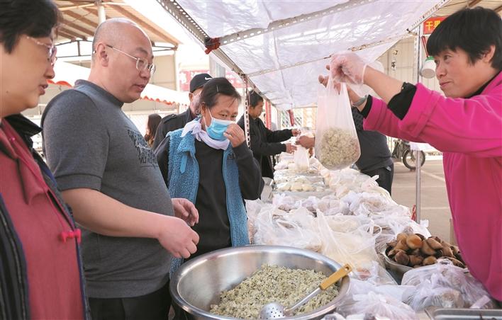 4月7日,市民在忻州城区光明市场购买蒸榆钱菜。春暖花开时节,田地里的不少野菜都摆上了农贸市场和超市,深受消费者喜爱。(宫清华摄)