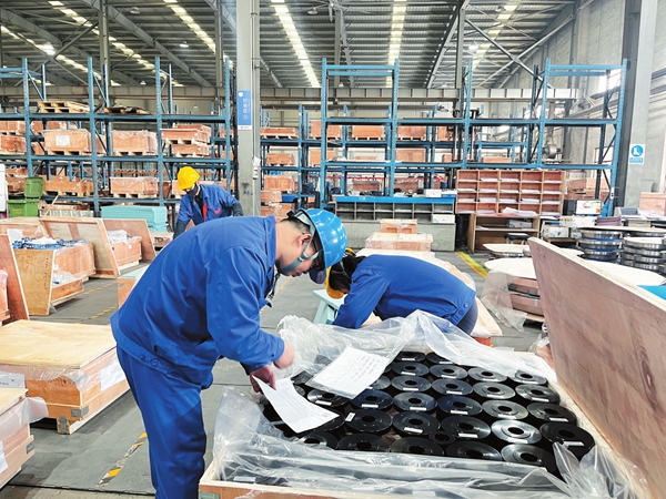 山西管家营法兰锻造股份有限公司严格管理、科学生产,通过设备升级与技术创新,为企业发展注入新动能。图为员工对外销产品进行检测登记。(郭晶晶 刘婧摄)