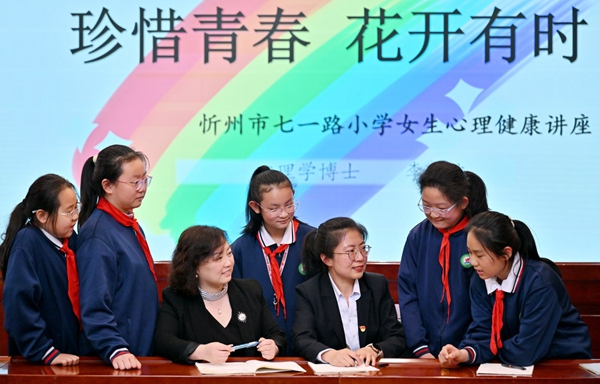 4月18日,忻州市七一路小学特邀忻州师范学院李泳波博士走进校园,为四、五年级女学生开展了一场生动有趣的生理健康知识讲座。讲座中,李博士通过图文并茂的PPT和趣味动画,用通俗易懂的语言讲解了青春期身体发育特点、个人卫生护理等知识,并针对学生常见的困惑进行了互动答疑,引导学生树立正确的健康观念,学会自我保护。 (冯晓磊摄)