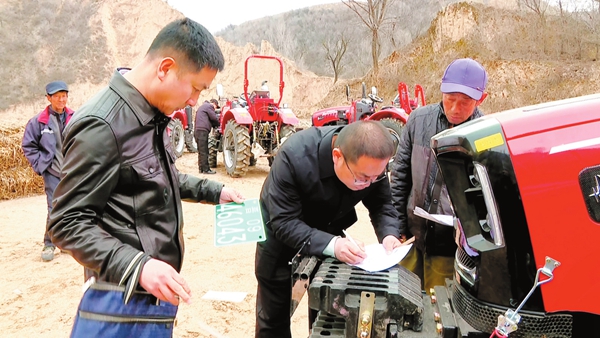 近日,河曲县行政审批局开展了“田间地头办实事”活动,为当地农民新购置的轮式拖拉机现场办理登记查验手续,用实际行动助力春耕生产。(张靓周三光摄)