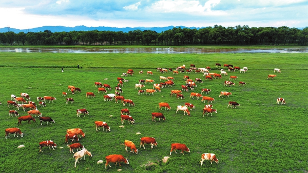 河水长,牧草肥,牛儿壮。定襄县受禄乡因地制宜扶持养殖专业户做大做强,在沿滹沱河冲击扇的盐碱荒滩地带规划出片区大力发展肉牛养殖业。(张晋兰摄)