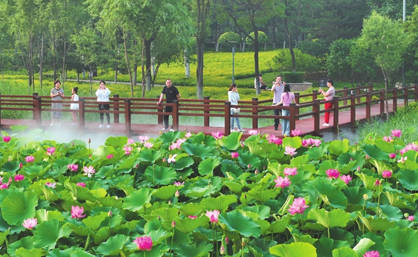 近日,云中河景区的荷花竞相绽放,吸引众多游客前往赏荷花、闻荷香。(张存良摄)