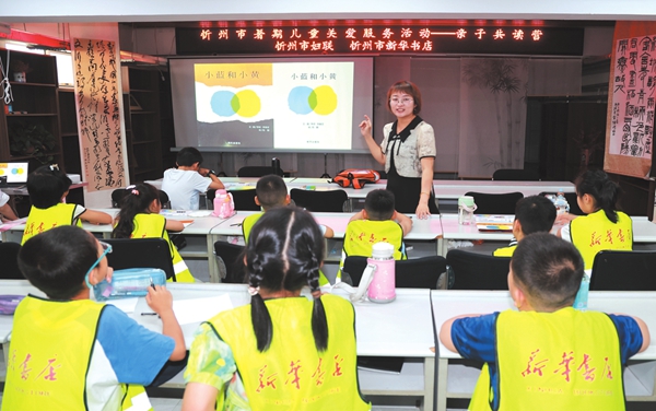 7月17日,忻州市新华书店联合市妇联举办了“亲子共读”暑期儿童关爱服务活动,焦芳老师为小朋友们讲述绘本故事,让孩子们在生动的故事中感受阅读的快乐。(张存良摄)