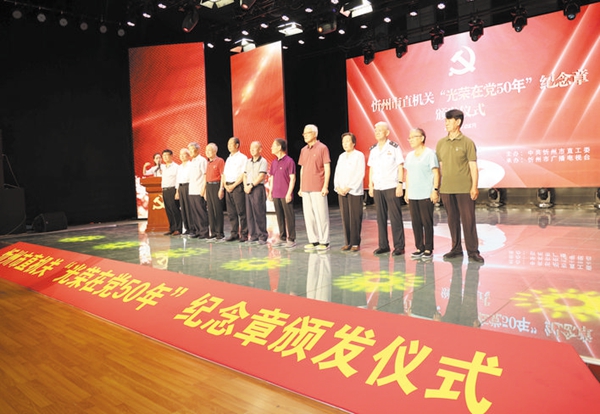 6月30日,忻州市市直机关举行了“光荣在党50年”纪念章颁发仪式,12名老党员代表获颁“光荣在党50年”纪念章。(张存良摄)