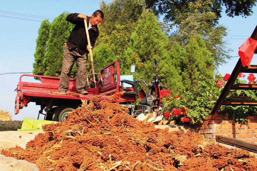 保德县腰庄乡张家卯村红高粱喜获丰收,9月22日,村民将收获的红高粱穗卸车。近年来,该县紧抓农业产业结构调整的有利契机,因地制宜推广种植红高粱等抗旱节水杂粮作物,实现了节水增效,有效保障了粮食安全。(张剑光 摄)