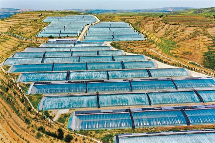 峁梁之间,沟壑纵横。下了高速,路随峁转,快到榆岭窊,车窗外的风景也变了,密集闪过一排排人造林。上峁放眼,沟梁之间,成片的日光温室大棚宛如湖泊,在冬日暖阳下反射出粼粼波光。大棚之上,这边一排排白墙灰瓦是别墅群,那边人才公寓紧挨着老年公寓,飘扬着鲜艳国旗的地方是榆岭窊村党群服务中心。