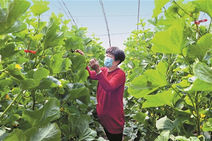 农户对温室大棚内的甜瓜进行打掐枝叶