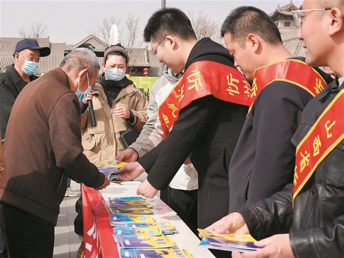 图为工作人员向过往群众发放宣传资料。