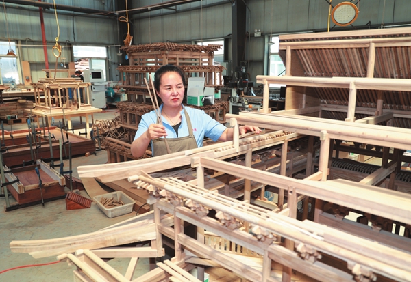 7月21日,在五台现代农业产业园区森雅轩古典家俱有限公司的加工车间,工人正在制作工艺品。森雅轩采用传统工艺制作,以古典家具、全屋定制、工艺品、老榆木系列产品四大生产板块为主。 (张存良摄)