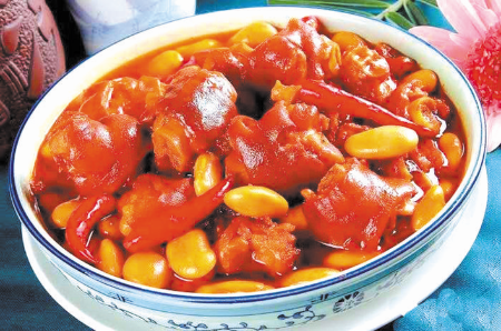 五寨猪蹄味美色艳,让人看了直流口水,主要材料有猪蹄、花生、香料、香菜等,是我国典型的传统熟肉制品,猪蹄营养丰富,含有丰富的胶原蛋白,经常食用,有养颜、抗衰老的保健作用,加之其具有极佳的适口性和独特的风味,深受大家的喜爱。
