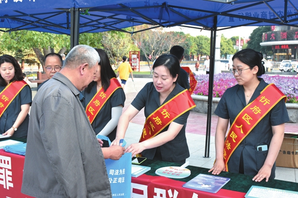 刘佳(右二)正在向过往群众发放宣传手册