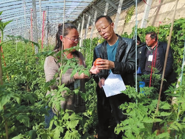 赵建华(右前)在大棚仔细检查番茄长势
