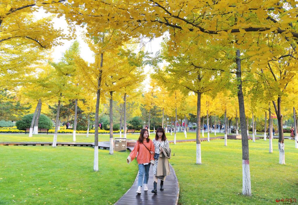 深秋时节,忻州城区随处可见花成带、绿成片、树成景的优美风景线。近年来,我市不断推进城市绿化,提升绿化档次,极大改善了人居环境。图为游客徜徉在人民公园银杏林内。 (张存良 摄)