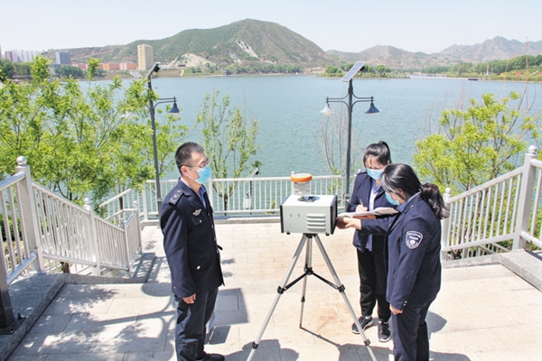《五台县水污染防治行动计划》的具体实施到了攻坚阶段,忻州市生态环境局五台分局将瀛湖公园列为重点保护水域,定期进行水面空气总悬浮微粒釆样,严格监控水污染,让水光潋滟、清澈见底的瀛湖公园成为市民、游人休闲观赏的好去处,集中体现了创建山西省环保模范县城的喜人成果。图为环保工作人员正在科学监测水环境。(金俊贤摄)