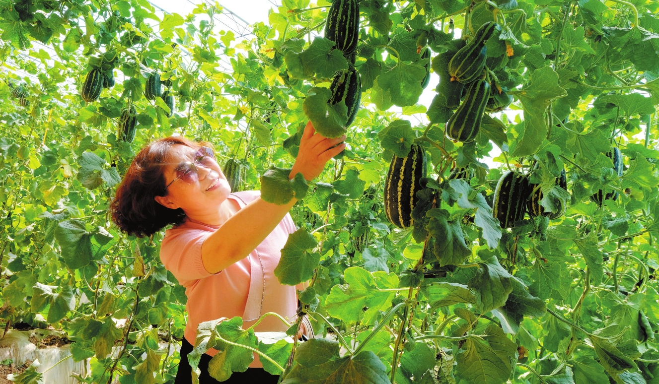 定襄县大南庄村香瓜种植专业户利用南瓜根系嫁接香瓜新技术,实现了稳产增产,亩均收益5万元以上。图为游客在采摘香瓜。(张晋兰摄)