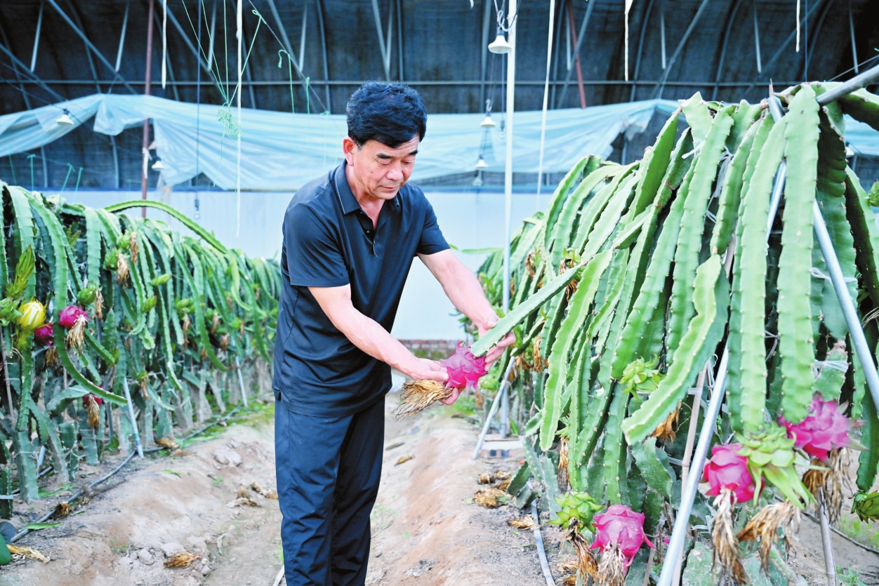 邬瑞华正在观察火龙果长势。冯晓磊摄