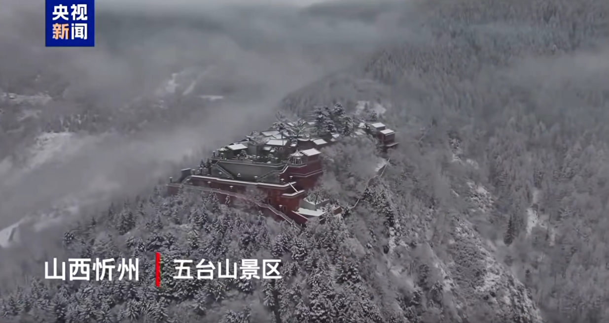 受冷空气影响,山西省五台山景区在立冬这一天迎来了今年入冬以来的第一场降雪。雪花纷纷扬扬,松柏缀满雪霜,古建筑在雪雾中若隐若现,远处的山林银装素裹,构成一幅流动的水墨画卷,让人仿佛误入仙侠世界。