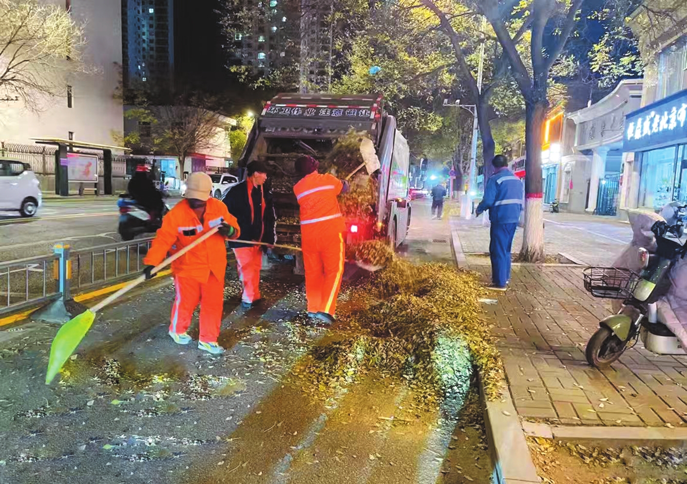 针对此次落叶量大、飘落集中、清理难度大的特点,市市容环境卫生服务中心科学调配力量,优化“人机结合、昼夜互补”作业模式,在主次干道等开阔路段,出动大型清扫车、落叶收集车开展“拉网式”巡回作业,充分发挥机械化效率高、覆盖广的优势,快速清理路面大面积落叶;对小街小巷、人行道、绿化带等机械难以覆盖的区域,增派300余名环卫工人加班加点进行“地毯式”清除;对落叶密集路段,实行分级管理、重点布防,动态调整清扫频次与人员设备配置,确保道路落叶无堆积。同时,该中心在保障清扫效率的同时,始终将作业安全放在首位,提醒一线人员注意防范树木倒伏、广告牌掉落等潜在风险,规范穿戴安全防护装备,确保人身安全。截至目前,累计出动作业车辆200余台次,清运落叶300余吨,城区主次干道、公共区域落叶已基本清理完毕。