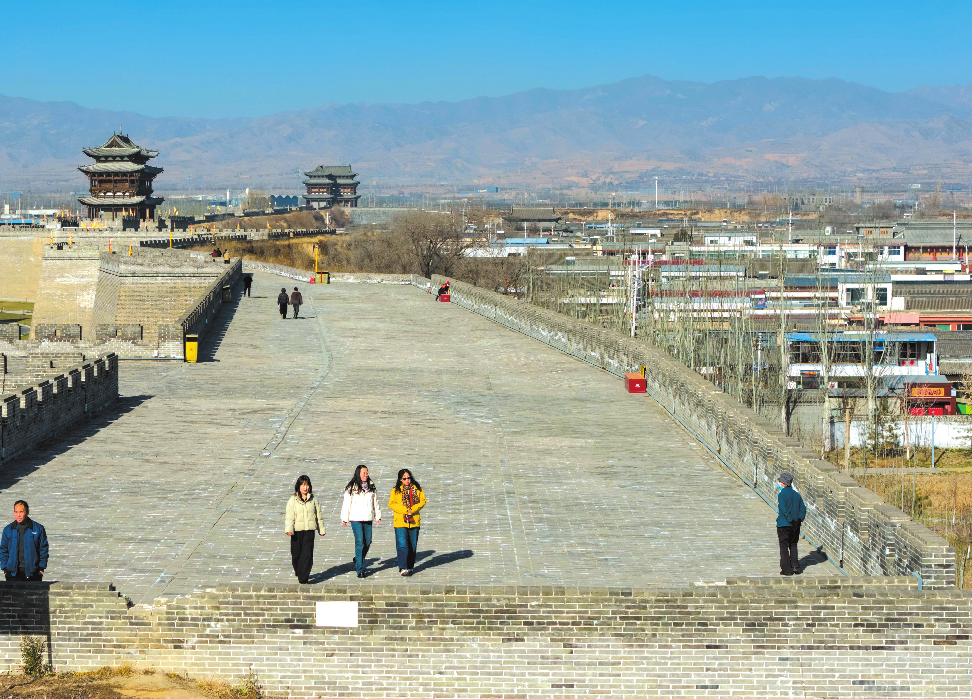 代州古城西城墙历经多年保护性修缮,是古城目前唯一修复完整并对外开放的城墙段落。图为12月1日,游人登上西城墙游览观光。王晋东摄