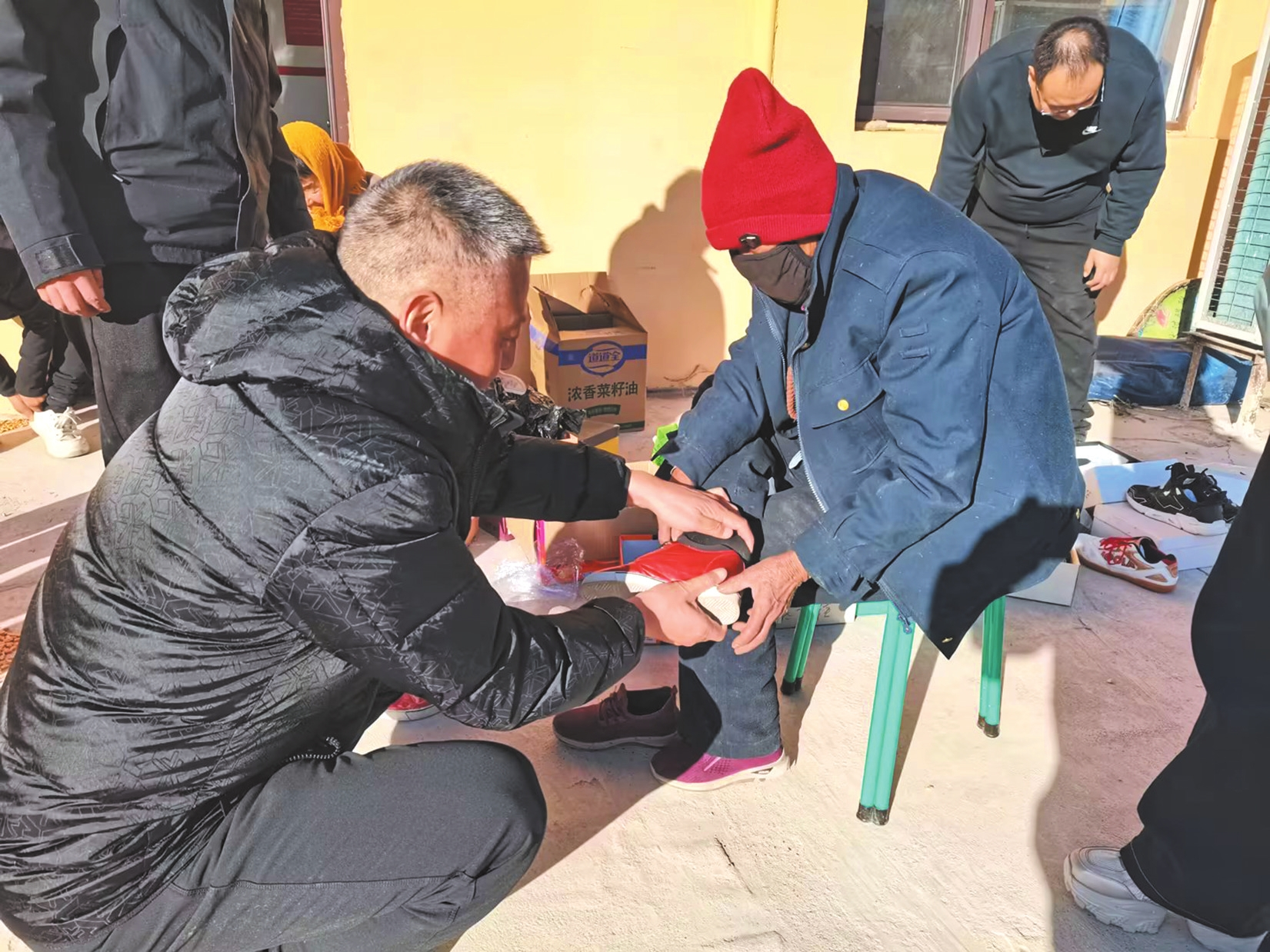 工作人员帮助老人穿棉鞋。