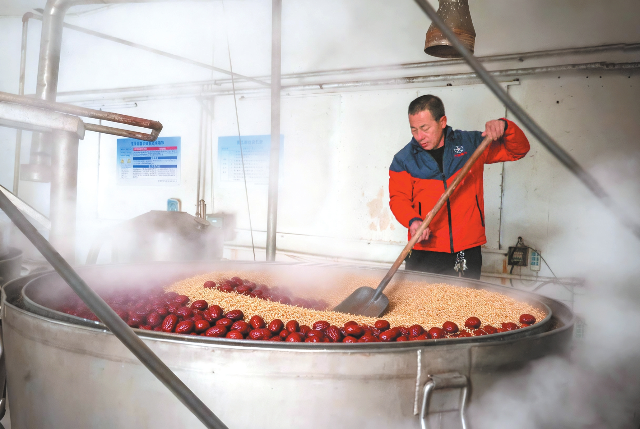 近年来,保德县贡枣酒开发基地以“保德油枣”与枸杞入酒,不仅更好地保留了果实的温补特性,也酿出了独特的地方风味。该基地不仅是当地推动红枣产业深加工、提升附加值的关键项目,也是将地理标志农产品转化为特色商品、助力乡村振兴的生动实践。图为保德县贡枣酒基地,工人在蒸馏车间翻动搅拌麦壳与红枣等原料,车间内蒸汽弥漫。范琛摄