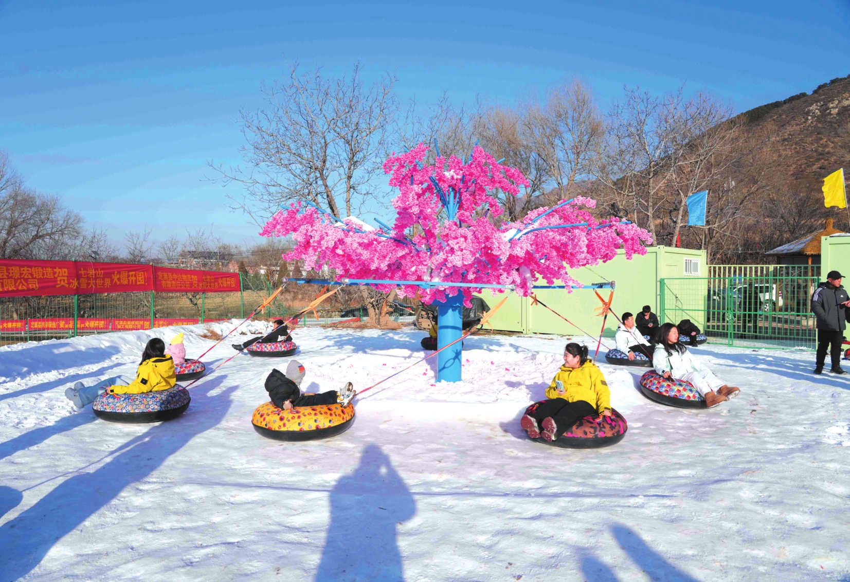 “咻——砰!”伴随着一阵呼啸与清脆的碰撞声,一个个彩色雪圈接连滑下,终点处游客的欢呼声瞬间驱散了冬日的寒意。