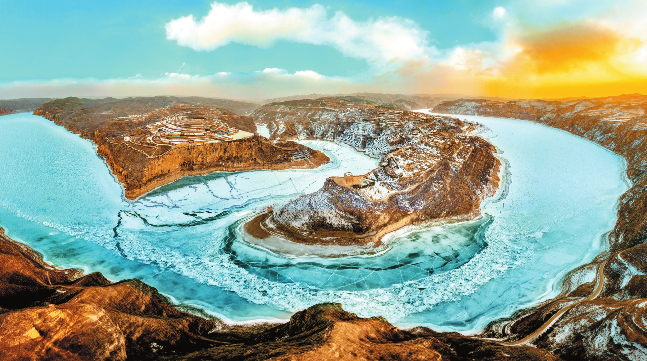 隆冬时节,偏关老牛湾被冰雪覆盖,清晨的霞光让黄土沟壑与冰面纹理交织出别样风景。范琛摄