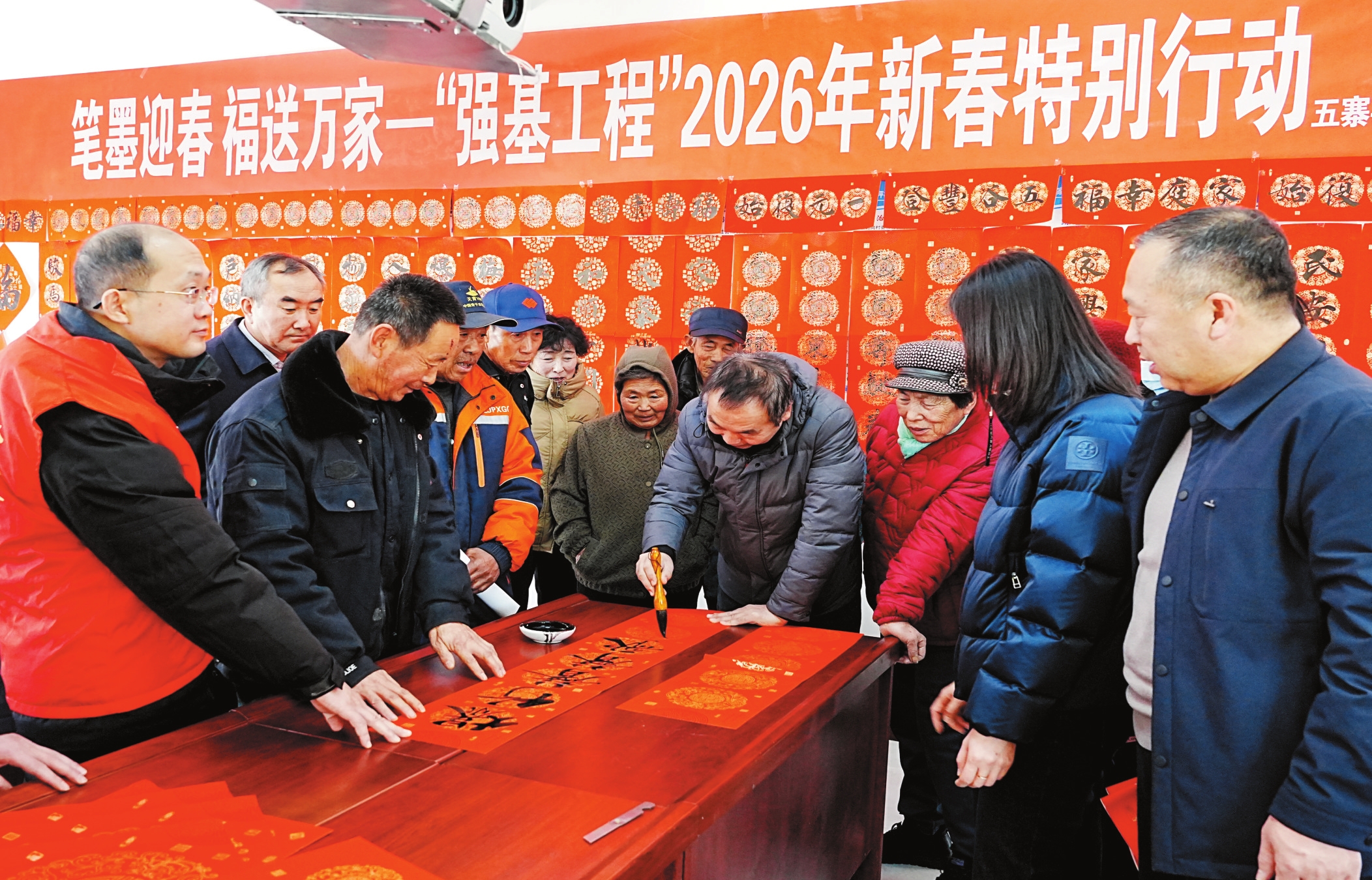 新春将至,年味渐浓。近日,由五寨县文联联合县总工会、团县委举办的“笔墨迎春福送万家”送春联活动走进李家坪乡李家坪、张家坪村,以笔墨为媒传递新春祝福,用文化服务筑牢基层精神根基,让“强基工程”的温暖触角延伸至乡村一线。刘笃效摄