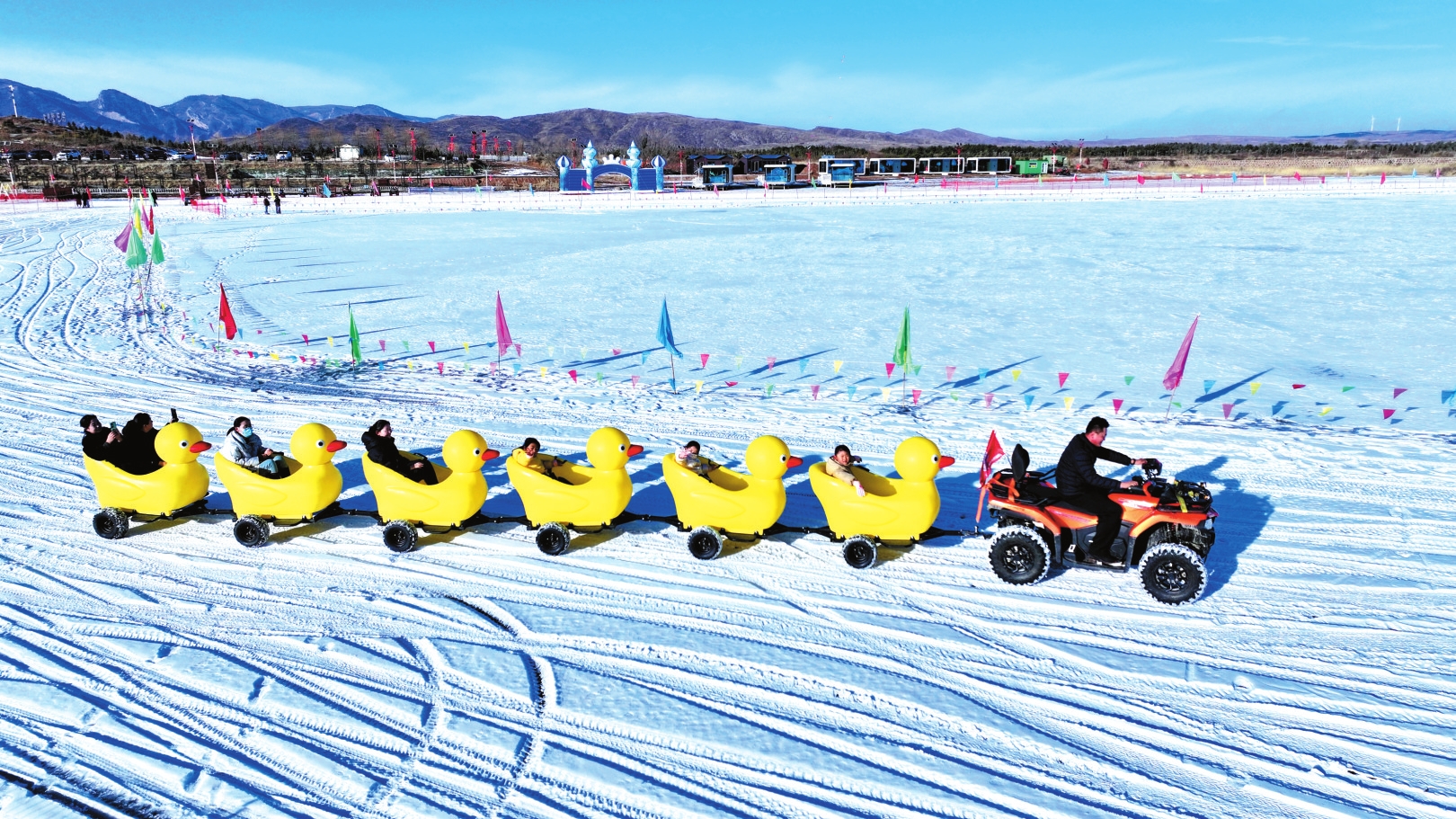近日,宁武县鸭子海冰雪大世界内红火热闹,一片欢乐景象。图为冰面上,游客们尽情享受着冰雪项目带来的乐趣。吴光宇摄