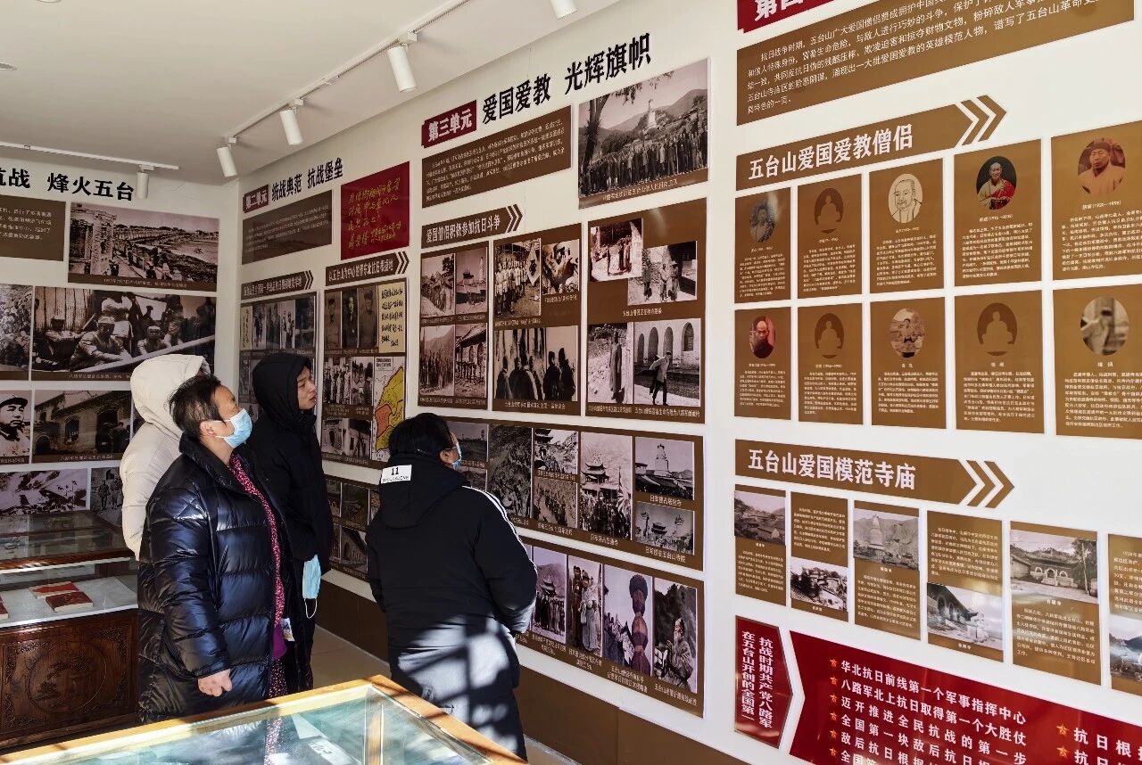 近日,在五台山塔院寺毛主席路居馆内,几名来自河北的游客怀着崇敬之情,在展厅中驻足参观。馆内一幅幅珍贵照片,宛如一部徐徐展开的历史长卷,让游客们深切感受到革命者的热血与豪情,铭记那段可歌可泣的光辉历史。