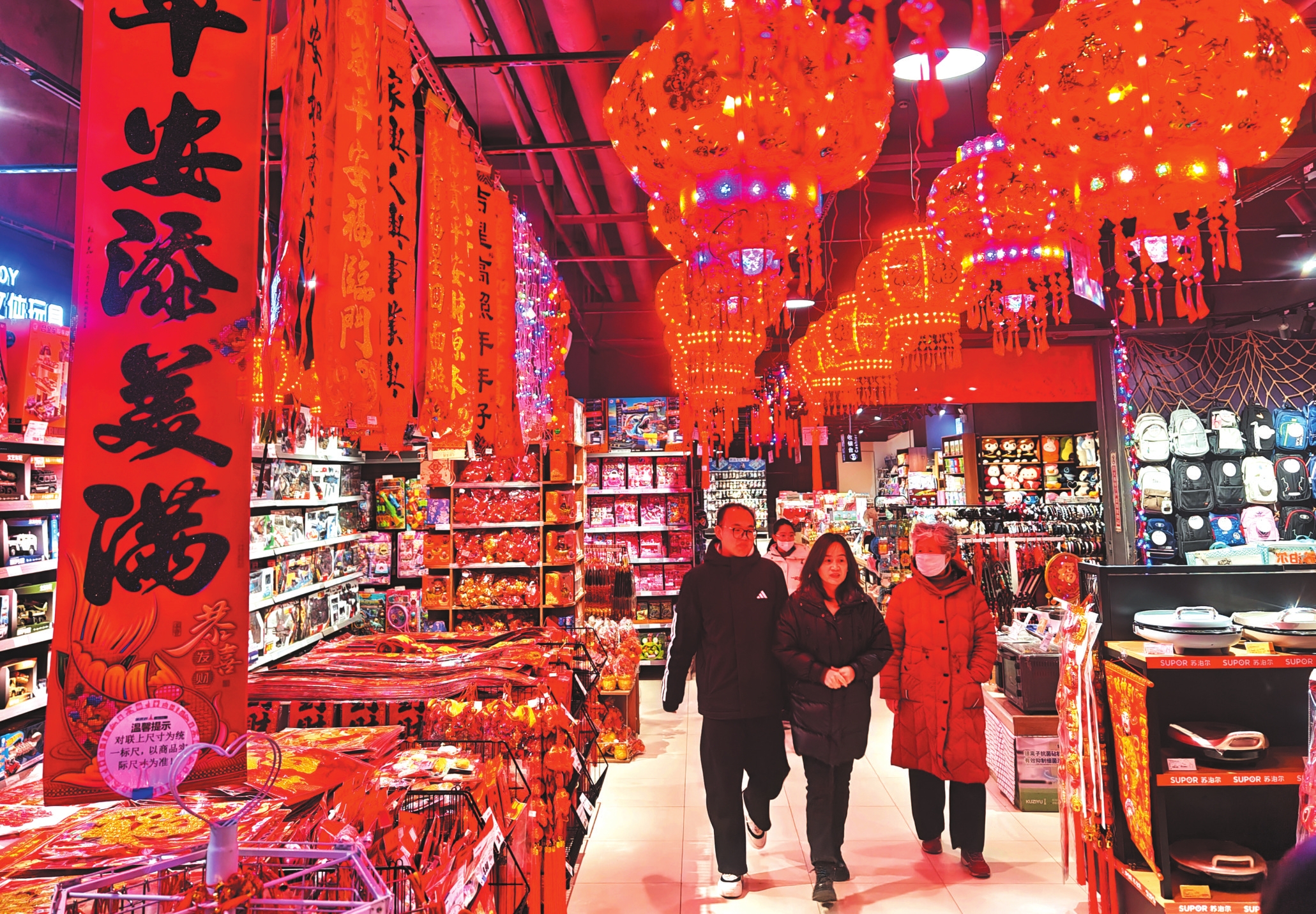 1月26日,原平市一大型商超内,市民正在选购新春饰品。春节临近,该市大街小巷处处洋溢着浓浓的年味,春联、灯笼、鲜花等年货摆满货架,顾客穿梭其间精心挑选、置办年货。褚震摄