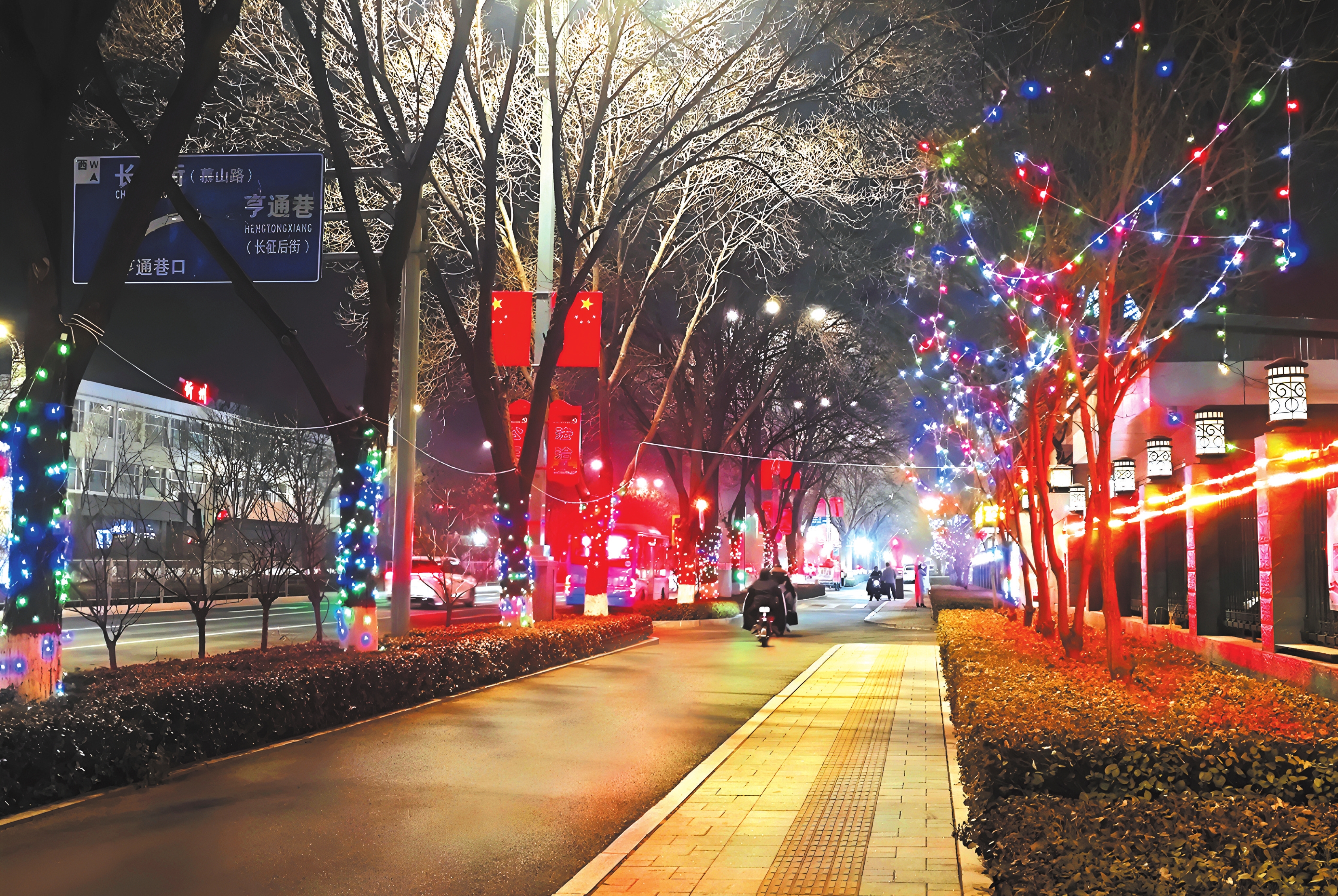 新春佳节将至,忻州城区街头的年味愈发浓厚。连日来,我市不少主干道两侧的树木都换上了“彩衣”,一串串彩灯缠绕树干,格外醒目。图为华灯初上的长征西街,五彩灯带在夜色中交织闪烁,将城市装点得流光溢彩,也温暖了市民的回家路。赵丹琦摄