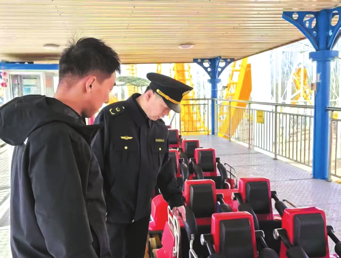 图为执法人员深入一线,检查游乐设施安全状况。