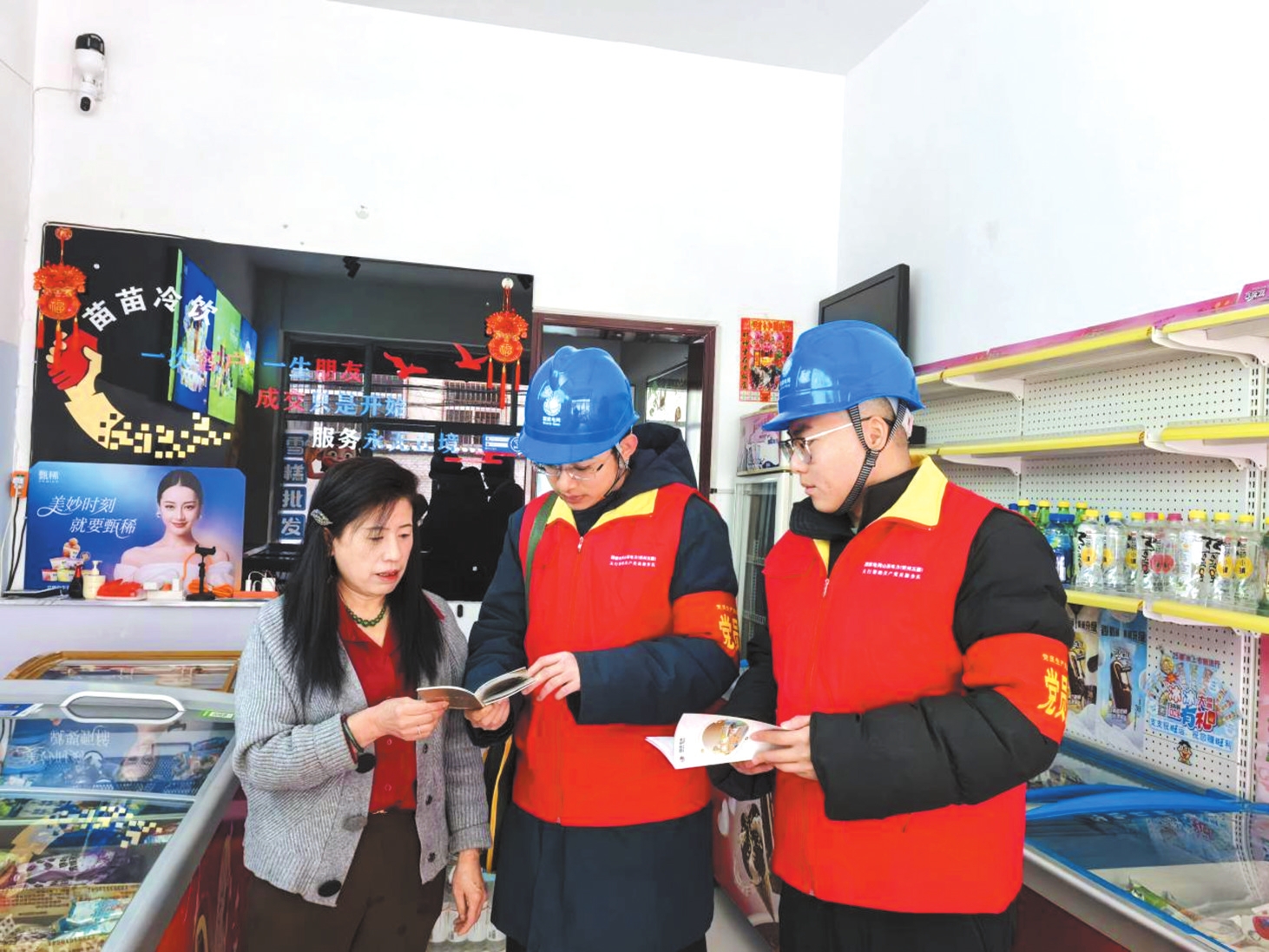 腊月廿七,年货市场人声鼎沸。商户张老板的炒货店门口排起长队,电炒锅一刻不停。就在这时,党员服务队队员推门而入:“张师傅,生意好啊!我们来帮您检查检查线路。”他们钻到柜台后,仔细排查私拉乱接隐患,又递上服务联系卡:“有事随时打电话,随叫随到!”张老板竖起大拇指道:“这服务,暖到心坎里了!”